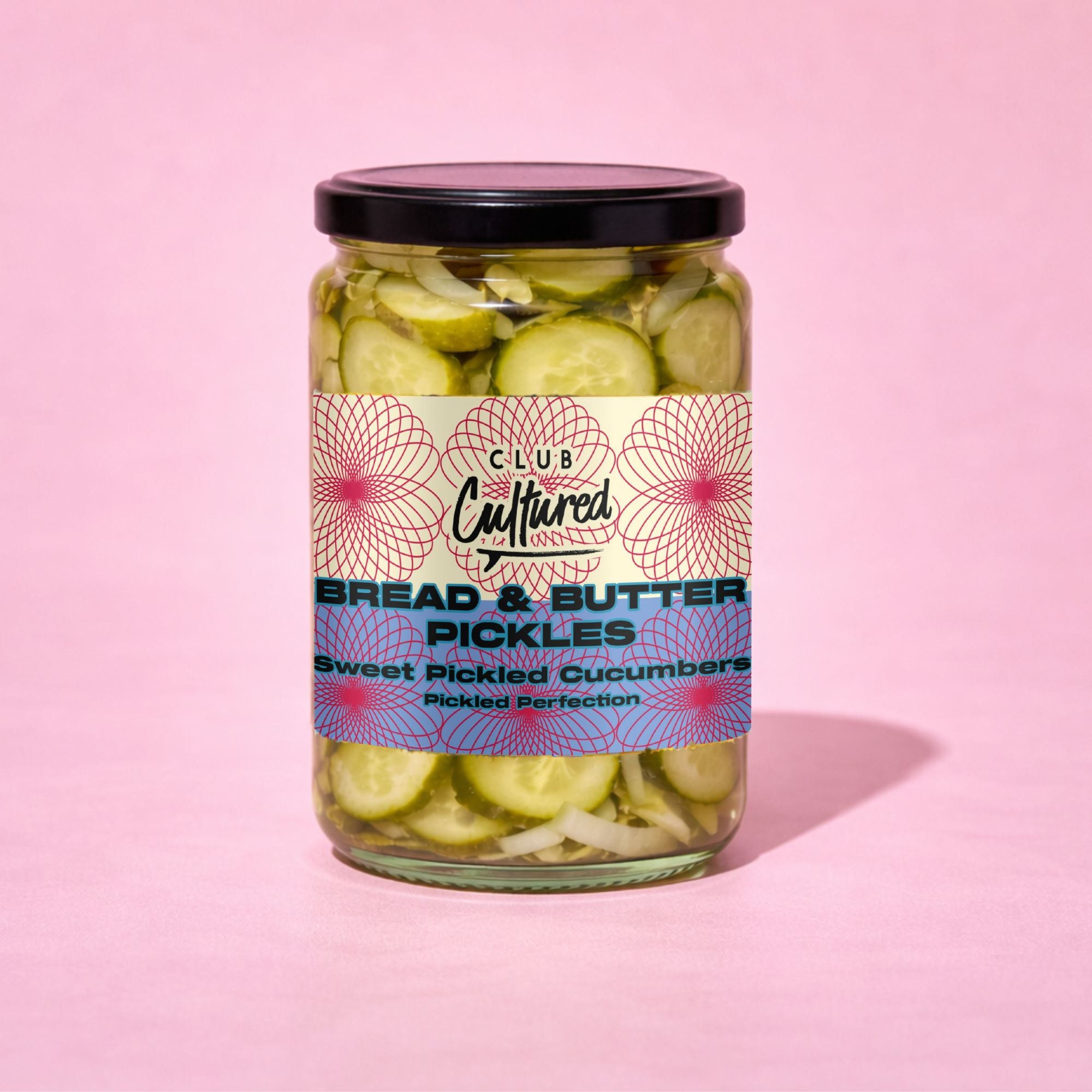 Our Bread & Butter Pickles are made with thinly sliced cucumbers and onions, gently brined in a seasoned vinegar solution with sugar, sea salt, cracked black peppercorns, red pepper flakes and garlic.